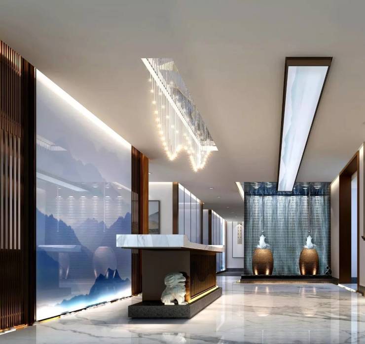 項(xiàng)目采用了禪意文化的手法進(jìn)行設(shè)計(jì),這個(gè)空間即融入了中國(guó)傳統(tǒng)風(fēng)格文化與現(xiàn)代時(shí)尚之中,既有中式的古香古色,又有現(xiàn)代的簡(jiǎn)單自然,東方韻味在現(xiàn)代的背景下若隱若現(xiàn),簡(jiǎn)約的中式造型與現(xiàn)代形式轉(zhuǎn)變?yōu)槭孢m,實(shí)用,為現(xiàn)代辦公設(shè)計(jì)重重的添了一份古典的韻味。禪意辦公室大廳設(shè)計(jì):以現(xiàn)代手法將古典語(yǔ)言融入中式意境,整個(gè)空間散發(fā)出悠然禪文化。頂上一通而過燈飾造型,如同一條河流,在對(duì)面機(jī)刨石上如瀑布般潺潺流下,兩個(gè)古樸的老缸不停地冒著噴泉。用較少即多的表現(xiàn)方式直接明了的體現(xiàn)了整個(gè)空間文化氛圍,留白的墻,黑色原始頂,現(xiàn)代中式家具與禪意的辦公桌,在現(xiàn)代與傳統(tǒng)的相碰中呈現(xiàn)出了一個(gè)既有文化又有時(shí)尚感的辦公空間。