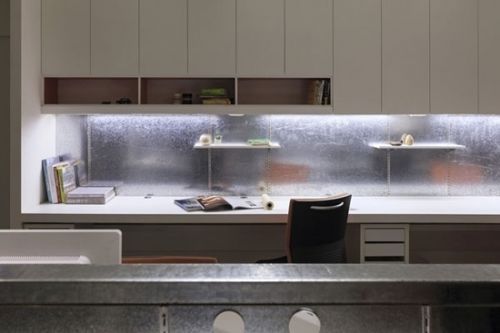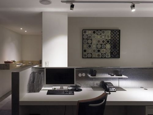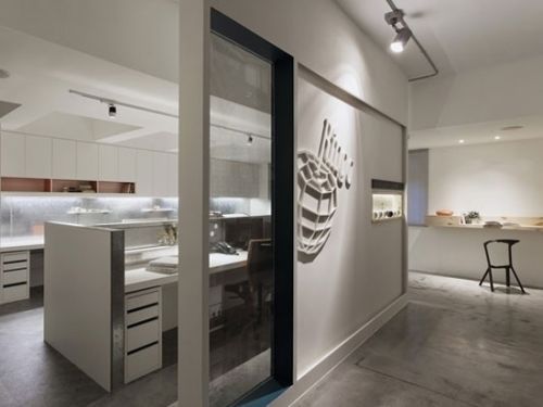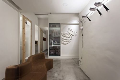 編輯點(diǎn)評:辦公室入口的面積相對較小,設(shè)計(jì)師很巧妙地采用矩形瓷磚、并且在末端采用深色瓷磚進(jìn)行裝飾,顯出放射狀,有放大視覺效果的功能。