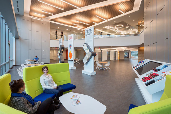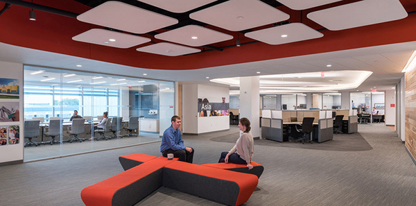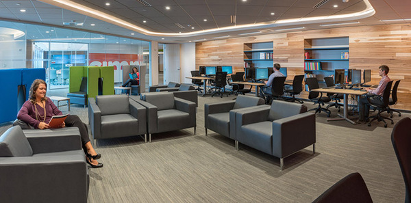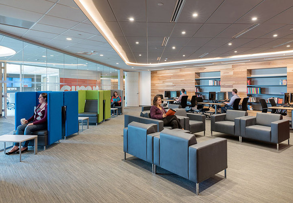 除了協(xié)作空間,設(shè)計團(tuán)隊還設(shè)計了一處閱覽空間,給團(tuán)隊成員提供一處寧靜的工作區(qū)。為了解決開放式空間所帶來的聲學(xué)問題,設(shè)計采取多種措施確保聲音的隱私性,以及視聽會議室和人多的房間的隔音性能。