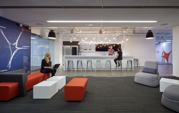 辦公室裝修設(shè)計(jì)以藍(lán)色來映襯橙色(公司標(biāo)識色),簡約而醒目的色塊組合營造出青春活力氛圍。整體色調(diào)與其企業(yè)風(fēng)格相呼應(yīng),形成統(tǒng)一的視覺體系。