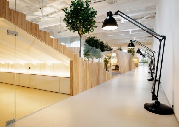 偌大的辦公空間沒有任何視野的遮蔽,以深紅、淺灰色地毯作為平衡,讓整個(gè)辦公室就像是漫游在夏日夢(mèng)境森林,放松又舒適,白色光線給空間制造通透感,然后以暖光襯出暖意。