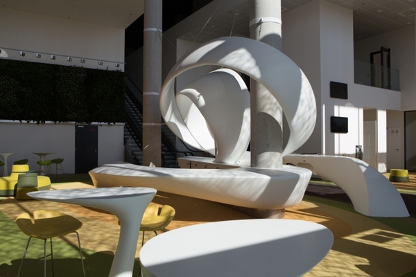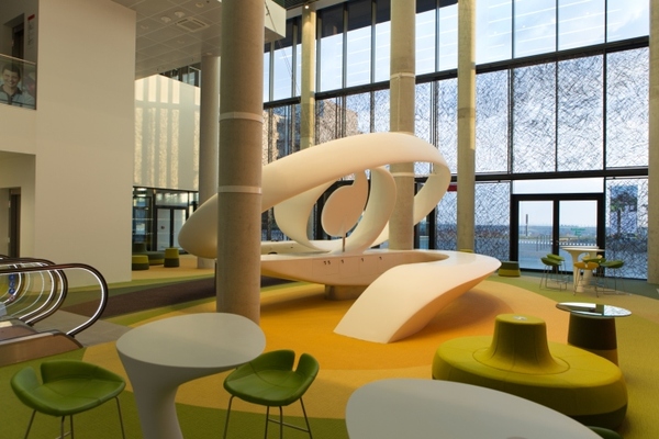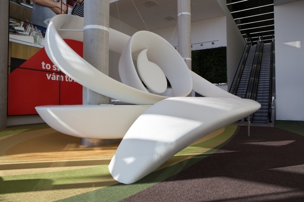 沃達(dá)豐公司期待的,是一個能夠展示出燦爛明天,并且能夠表明公司對未來前景信心的入口大廳。這個非同一般的大廳里,*引人注目的使那個三層樓高的藝術(shù)雕塑作品。