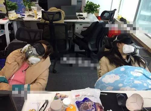 中午午休時(shí)間,兩名女員甚至戴著這種防毒面具,在座位上睡覺(jué)。記者發(fā)現(xiàn),戴有類似防毒面具的員工不下10人。