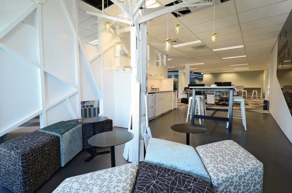 這里沒有傳統(tǒng)的主管辦公室,空間設(shè)有220個工作點,這樣人人都擁有自己的辦公桌。設(shè)計師打造了30多個休閑空間穿插于工作區(qū)中,以滿足團隊協(xié)作、交流、頭腦風(fēng)暴或獨立思考。