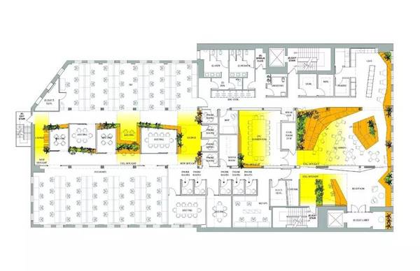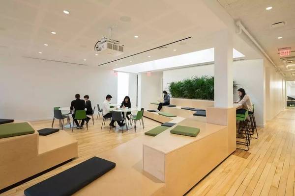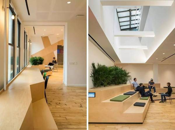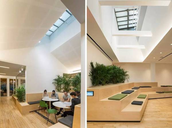 Sn?hetta對(duì)Slack新紐約空間設(shè)計(jì)的靈感來源于**特色的城市小院。從Paley Park的室內(nèi)景觀中吸取靈感,竹植物提供自然的隱私屏幕,并為綠化帶來空間。現(xiàn)有四個(gè)天窗與放大,八字天花板大大增加了室內(nèi)以及內(nèi)部小庭院的自然光線。