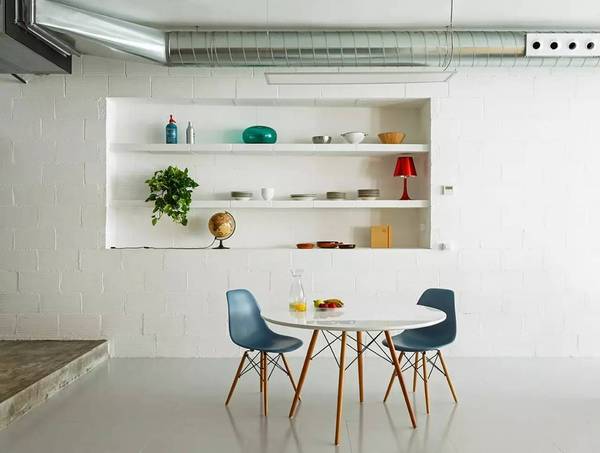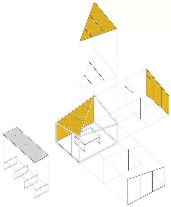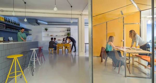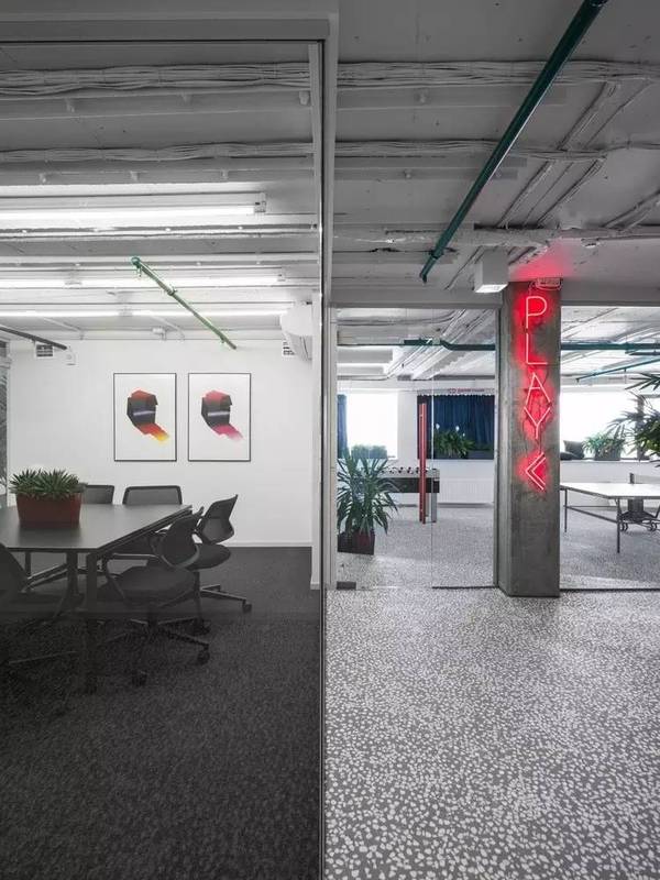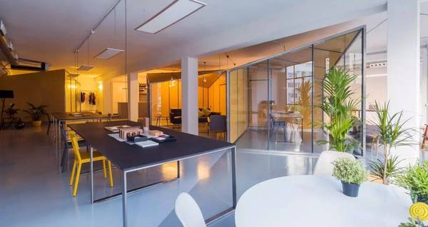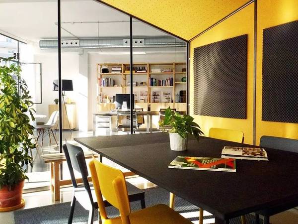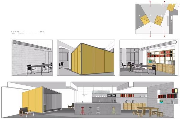 此空間是一個(gè)由鋼筋混泥土柱子和懸梁支撐的300平米大開敞空間。結(jié)構(gòu)由三個(gè)中心線組成,清楚地配備了所需的功能計(jì)劃:兩個(gè)辦公室位于相對的兩側(cè),公共會(huì)議室和休息區(qū)在中心。