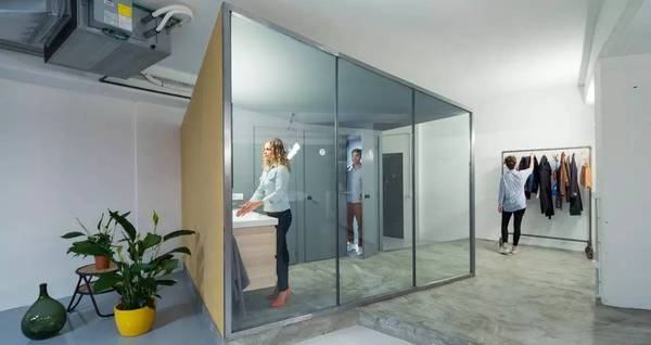 正交排布的網(wǎng)狀結(jié)構(gòu)體系和模塊化的立面相結(jié)合使中間的區(qū)域比兩邊要窄,為布置兩個(gè)相似的辦公室制造了難度。建筑師決定在空間中插入三個(gè)塊狀空間,其中兩個(gè)用于會(huì)議,另一個(gè)用作衛(wèi)生間。其獨(dú)立于原有空間存在,使空間更有層次和秩序感。
