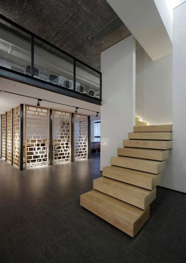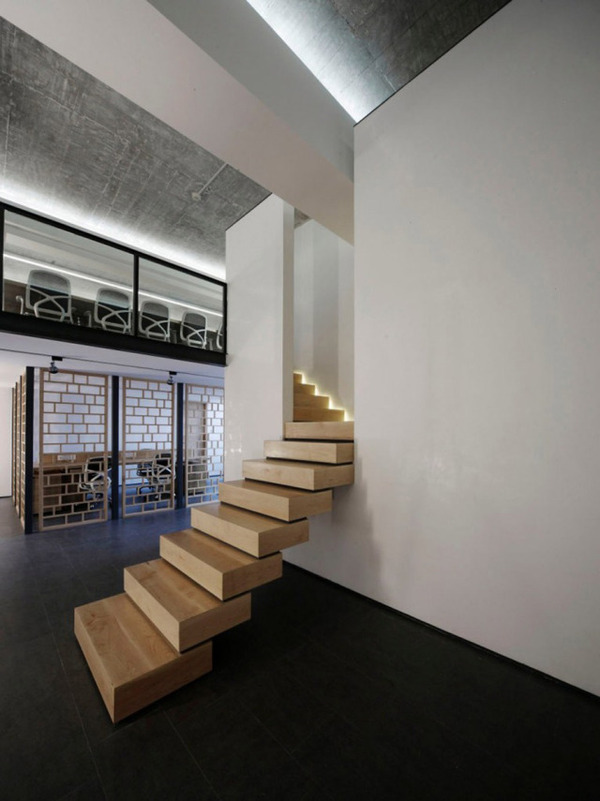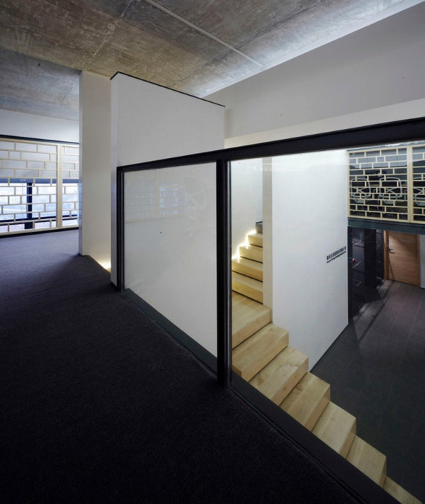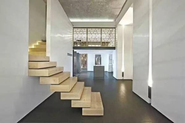 挑高的入口門廳中,地面運用了灰色仿古磚,原本白色的天花板表皮被鏟掉,露出原有的混凝土表情,打砂的方式使天花板既達到防塵的效果,又擁有特殊的細膩肌理。門廳中央為兩道白墻,白墻中間的細縫夾著一道窄窄的無扶手樓梯。這個看似冒險的設計實際上解決了屋頂建筑橫梁帶來的對閣樓人員流通的阻礙問題。