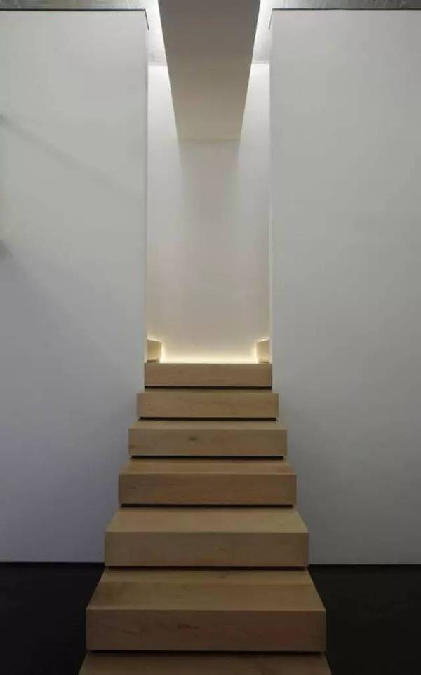 樓梯在中間往兩側分開,在高高的白墻中間,如同一道通往別處的裝置,吸引觀者登梯探訪。通過白墻和天花間露出的微光,可以看到白墻并未真正與墻接合,且邊緣用鋼條鑲嵌,展露出更鮮明挺拔的體塊形狀。為了提升空間的立體感,門廳沒有設置照明設備,唯有從遠處墻壁的燈柱迎來的淡淡白光,令觀者一進門即在這份寧靜中得到放松。
