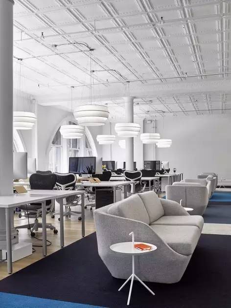 整個(gè)辦公區(qū)成L形布局,一條由藍(lán)灰相間的瓷磚鋪成的通道將員工迎入辦公區(qū),辦公區(qū)擁有*多的自然光照,同時(shí)來自于Rich Brilliant Willing公司巨大的燈具為整個(gè)辦公空間在晚間提供舒適的照明環(huán)境。會(huì)議室結(jié)合歐式與美式兩種風(fēng)格,簡(jiǎn)潔時(shí)尚的特點(diǎn),為空間增加了透明感?;疑玀oroso沙發(fā)和白色Anglepoise經(jīng)典燈具的休息區(qū),則為員工提供了舒適的飯后咖啡與休憩空間。