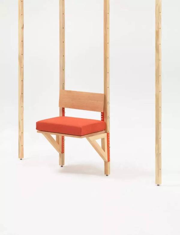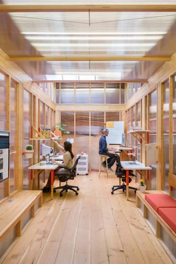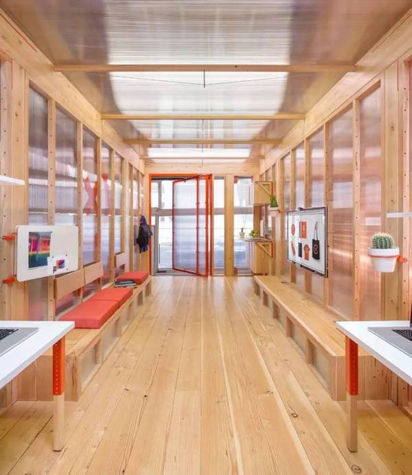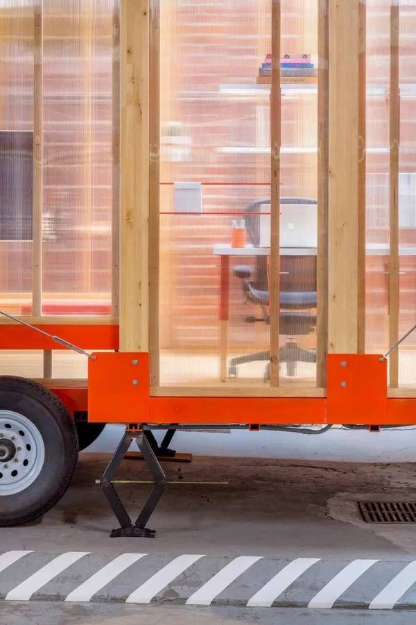 設計師保留了拖車的后梁結(jié)構(gòu),使用聚碳酸酯面板作為整個辦公室的墻壁。這種材質(zhì)的面板允許大量光線填充空間,同時也能吸收一些自然光,使得室內(nèi)光線不那么刺眼。設計師用從本地采購的道格拉斯冷杉木來與半透明的墻壁搭配。 此外,他們還大膽的采用紅色以及其它鮮艷的顏色來活躍氣氛。