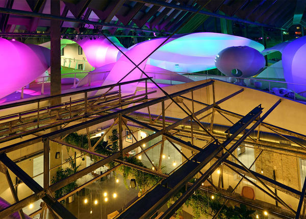當夜晚降臨,華燈初上,白色的體量被賦予了動感繽紛的色彩,更是美輪美奐充滿迷人的魅力。這里還有一顆盛開著上千朵“鮮花”的大樹,而這些“鮮花”實際上都是由雀巢的包裝紙制作而成。