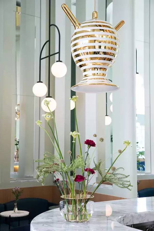 值得注意的是,除了椅子之外,旅館里包括燈飾、桌子以及大大小小的裝飾物都是 Masquespacio 團(tuán)隊專門為其設(shè)計的,幾何圖形與色彩的組合與碰撞幾乎隨處可見,既是 Masquespacio 的標(biāo)志性風(fēng)格,也強(qiáng)化了瓦倫西亞休閑旅館的辨識度。