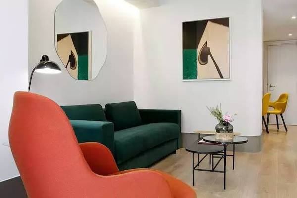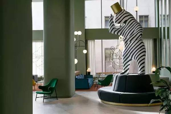 用色毫不膽怯,單單是酒店大堂中的沙發(fā),就有紅、綠、藍(lán)、粉、灰等六七種顏色;淺綠色和深紅色的沙發(fā)被特意組成了一對,擺放在一起,卻沒有艷俗感。