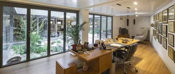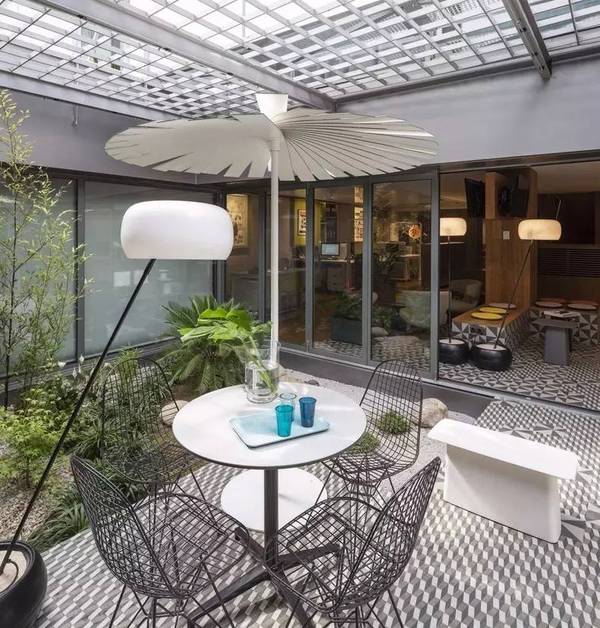 辦公室是建立在一個(gè)室內(nèi)的庭院之中的,雖然辦公空間是圍繞著室內(nèi)的小花園的,但事實(shí)上,室內(nèi)的設(shè)計(jì)與其說是辦公室倒更像是圍繞著小花園的休息和活動(dòng)空間。種植著綠色植物的露天小花園中擺放著用以休息閑聊的簡單的家具,綠色是這里的主題,而用以分隔小花園和辦公空間的既不是堅(jiān)實(shí)的墻壁,也不是活動(dòng)的玻璃門,設(shè)計(jì)團(tuán)隊(duì)選用了落地窗來包圍這個(gè)公司員工每天都在使用的戶外小空間,以此創(chuàng)造了室內(nèi)外空間的連續(xù)性。