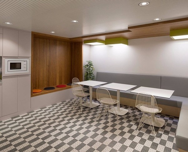 除了一些給空間增添溫馨氛圍的暖色系的應(yīng)用,一些淺色系的裝飾設(shè)計(jì)也遍布在整個(gè)空間 中的家具和配件上。一些白色、灰色的沙發(fā)、辦公桌、椅子和燈具都包含其中,但*突出的要數(shù)各個(gè)空間中都存在的黑白相間的幾何圖案的使用了,它們大都出現(xiàn)在地板和室內(nèi)的柱子上,給辦公室增加了更多現(xiàn)代化的氣息,也和室內(nèi)的木質(zhì)結(jié)構(gòu)形成了鮮明的對(duì)比。