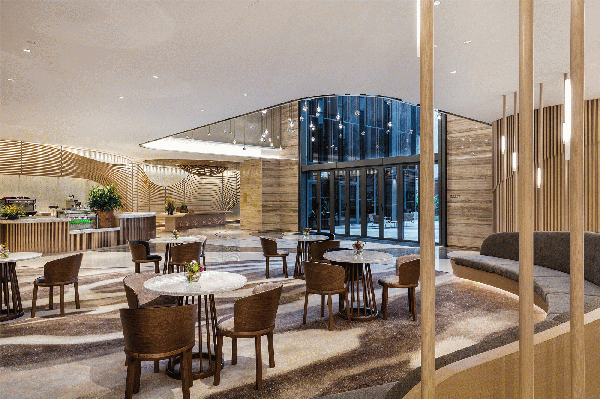 剛步入會所就被旋轉樓梯**至光線充裕猶如隧道般的走廊,咖啡廳內(nèi)的木材優(yōu)美地刻畫出空間的線條,搭配大自然色調(diào)的地毯及特殊的紋理,落地玻璃不僅映入戶外景色增強空間感,并巧妙地打造了與自然光線共生的聚會場所,隨著時間變化而讓光影在空間中翩翩起舞。