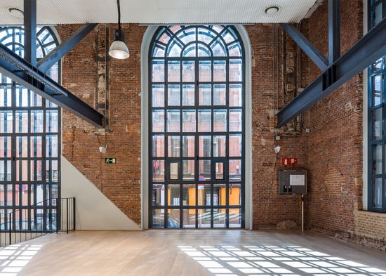 Jump Studios 需要改造的是位于馬德里的一所 19 世紀(jì)的電池工廠,有五層樓高,一些地方還保留了老式的紅磚墻。他們在對整個樓進行完全檢查后對區(qū)域做出了重新的布局,在北邊開辟了一個新的入口,用了有現(xiàn)代感的黑色金屬且貫通兩層。