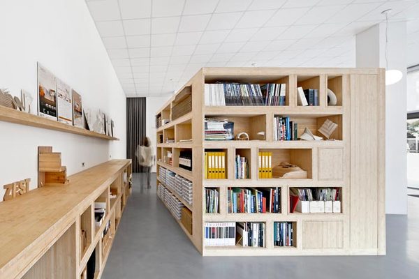 書柜的設計:當我們走向封閉的組合柜后方時,就看到了儲藏架,儲藏架與封閉組合柜彼此鑲嵌、不可分割,這樣的設計在人想不到的地方給人驚喜,一個小小的融合作用如此巨大,不僅增多了空間的收納能力,同時也讓空間多了一絲書香氣息。