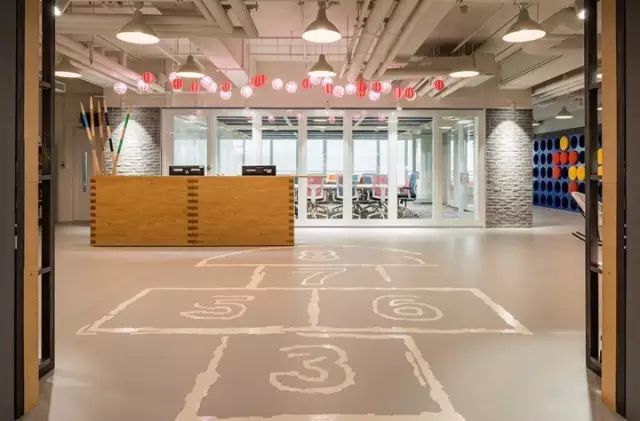 24,000平方英尺的辦公室共分為兩層。作為一家創(chuàng)意機構(gòu)其自身的辦公室定要符合其品牌形象,進入電梯廳,一道游樂場式樣的大門緩緩打開,地面上繪制著小時候大家熟悉的跳房子游戲圖形,親切而有趣的視覺圖形將視線引入接待大廳,并穿透層層玻璃會議室,看向遙遠的海港。