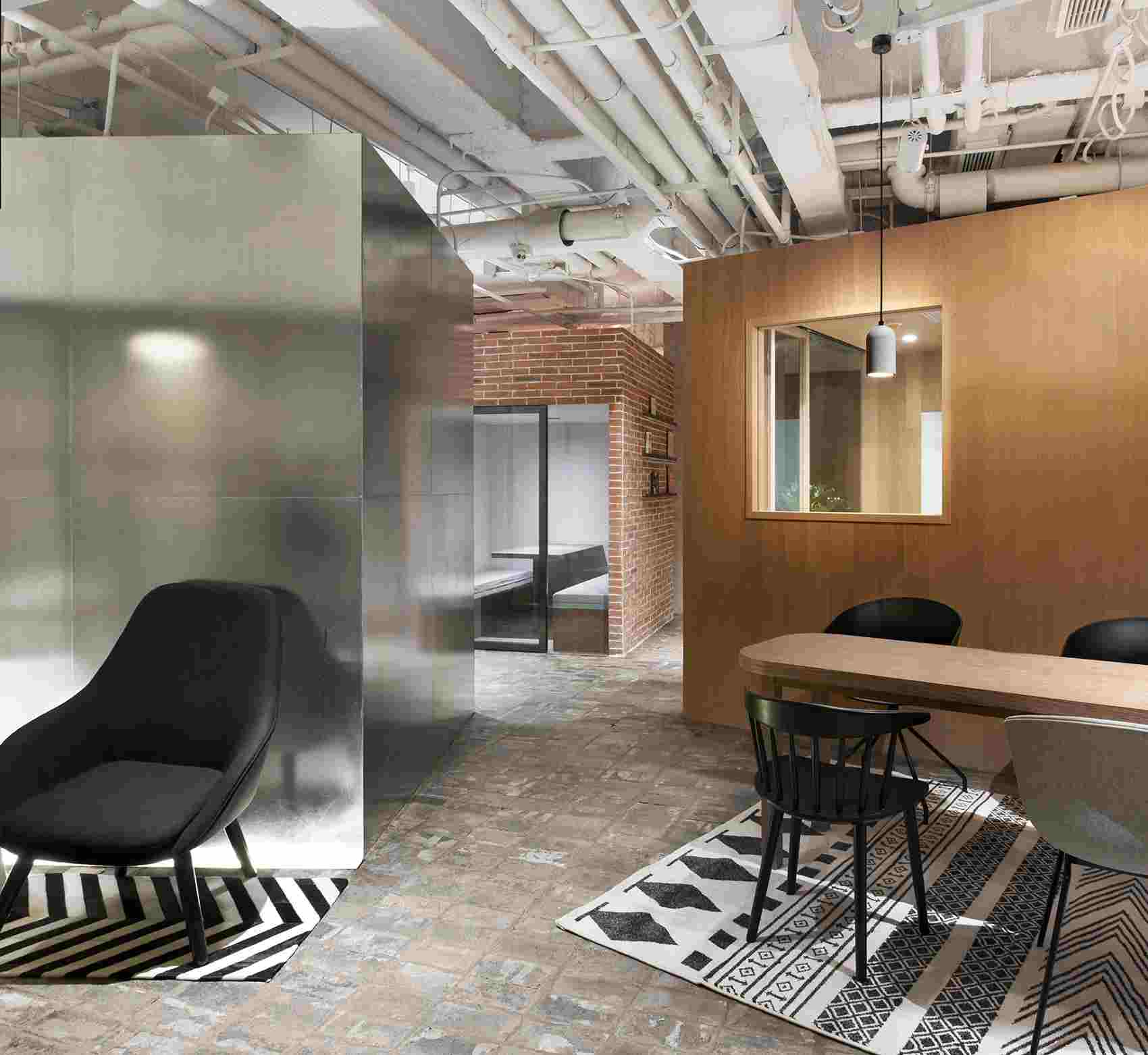 入口處,兩扇2000mm寬的大門設(shè)計(jì),當(dāng)玻璃門打開時(shí),室內(nèi)和走廊形成了相對開放的空間。房間使用了不同的材質(zhì),鍍鋅鋼板,水泥板,木板,紅磚,作為盒子的表面材料。地面則使用了灰磚,地面的破舊感和房子的不同材質(zhì)的對比,形成很大的反差,給人以強(qiáng)烈的視覺沖擊力。