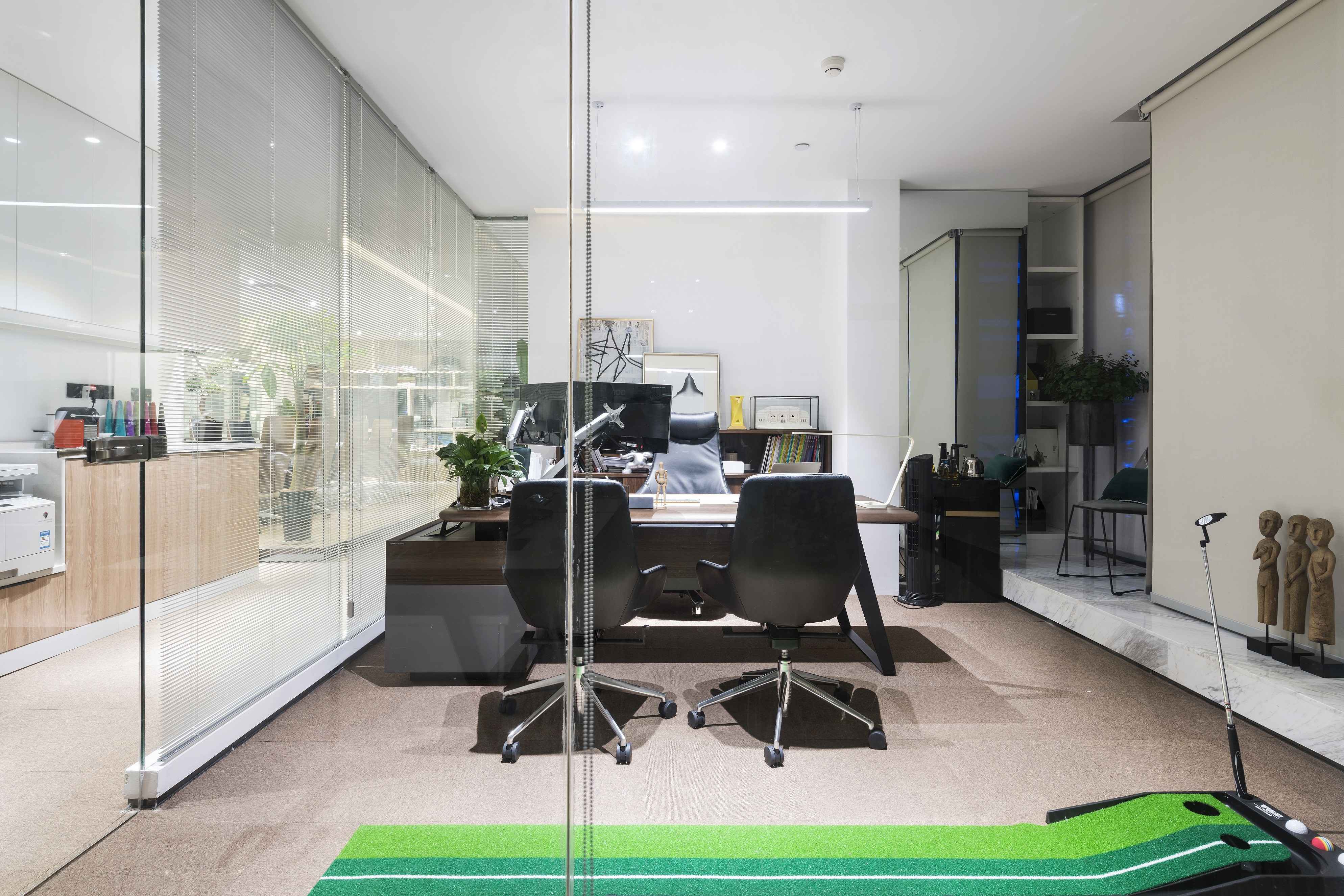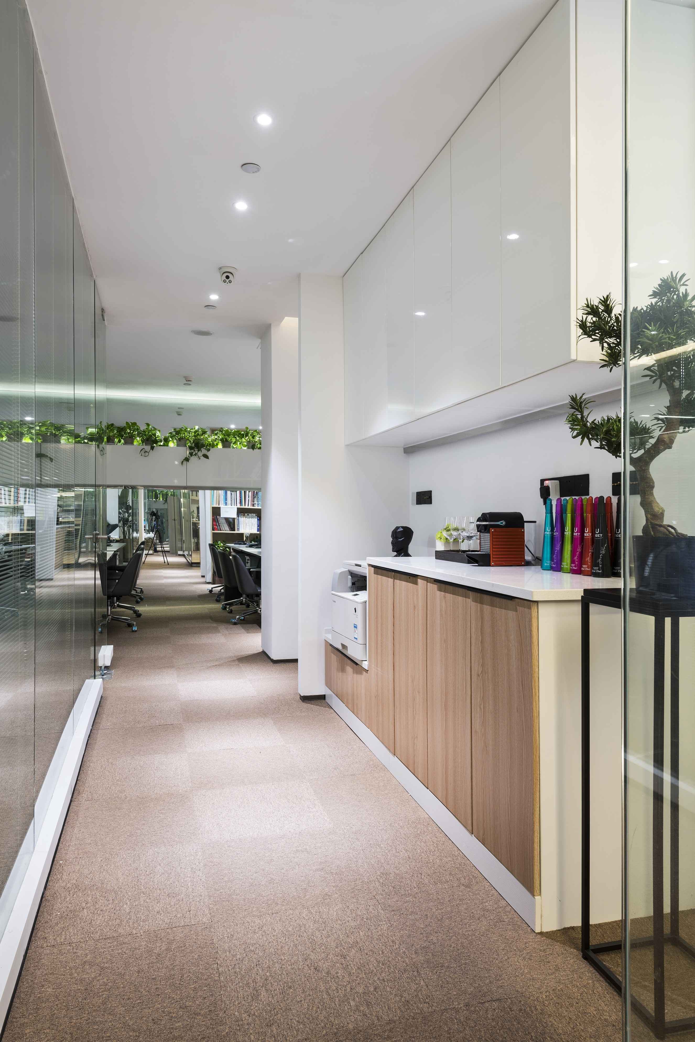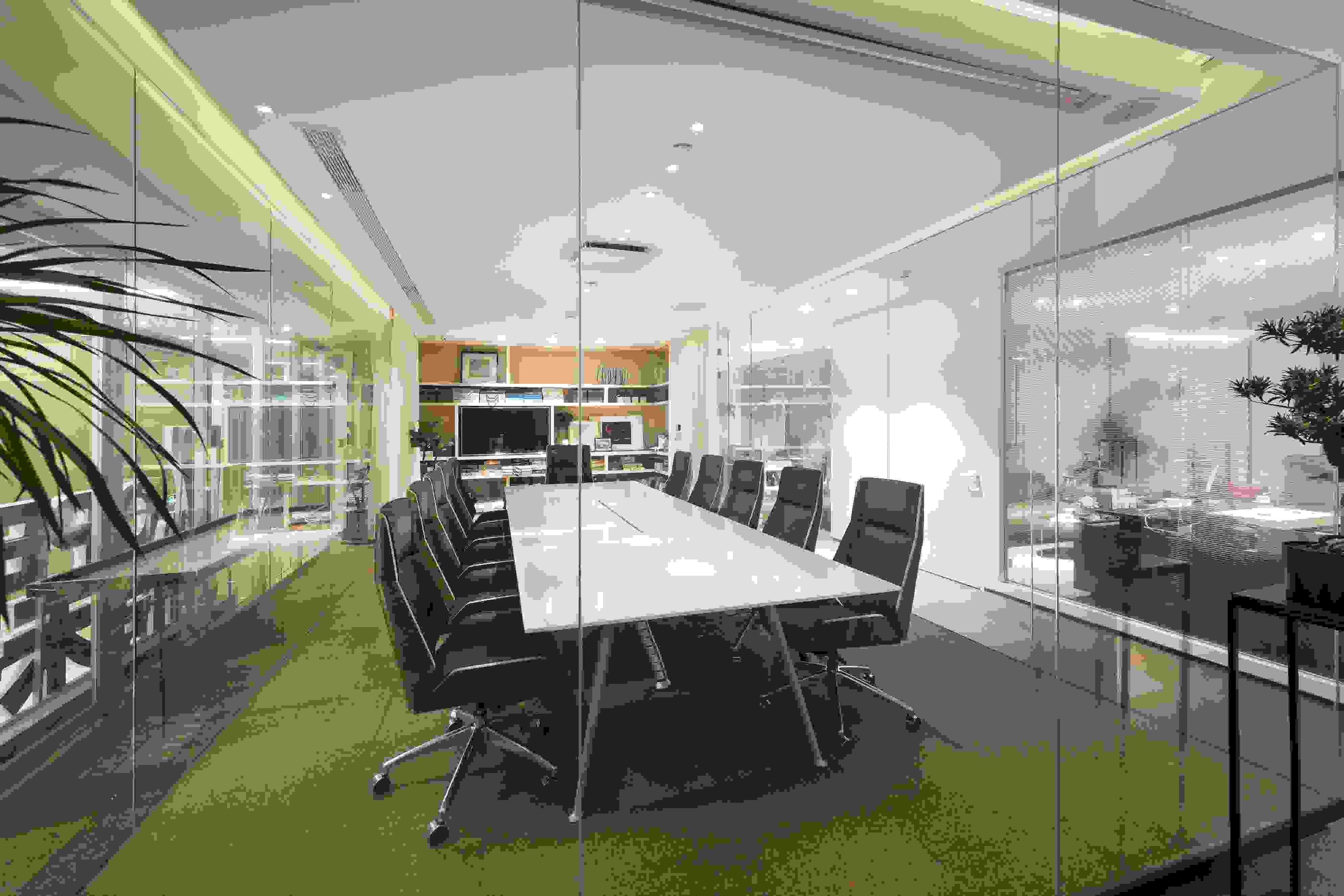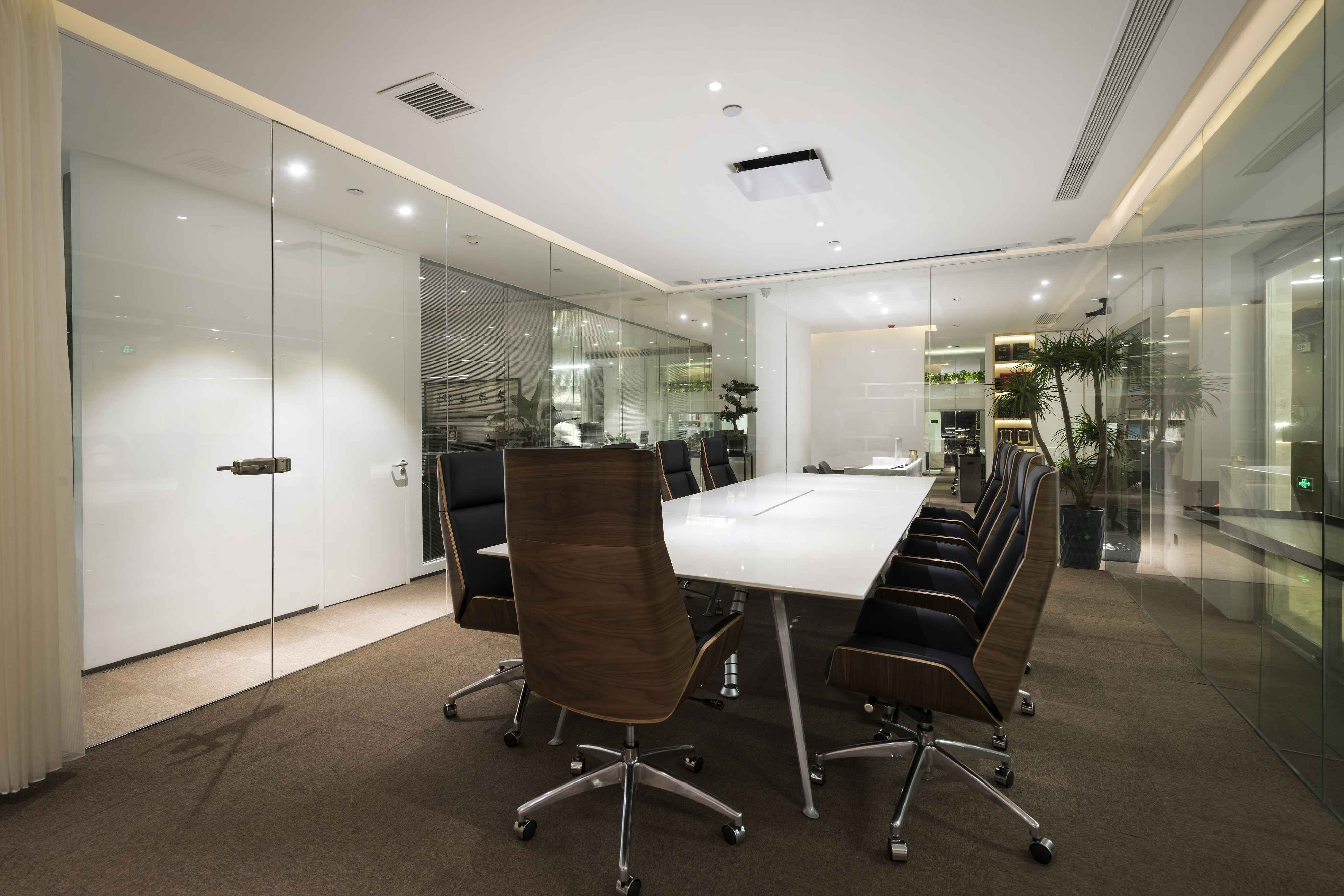 會議室以玻璃盒子為設(shè)計(jì)想法,運(yùn)用二次空間的形式,清楚地展示了空間里人與人之間的互動。