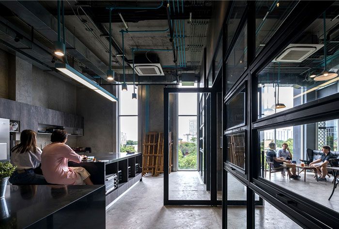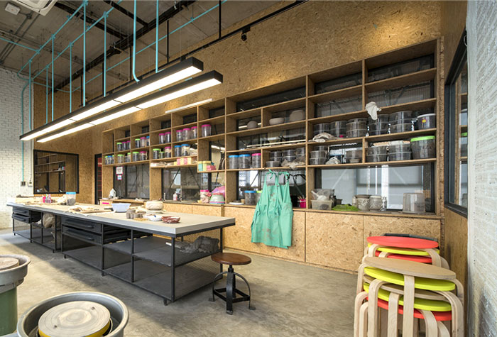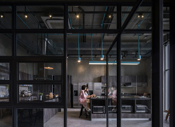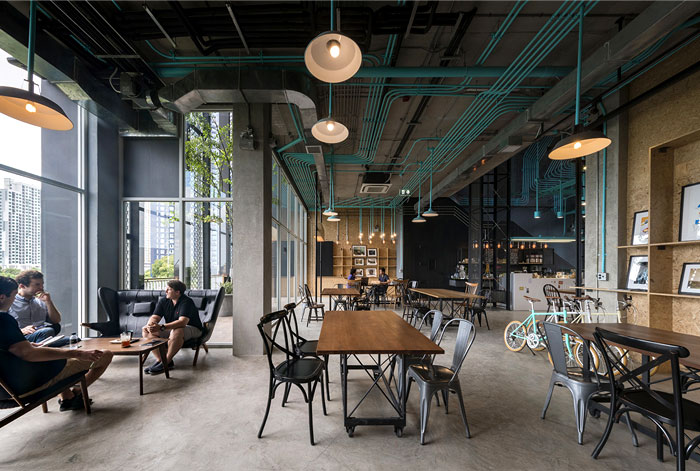 整個(gè) Co-Working Space 面積寬敞,以工業(yè)廠房的形式接待著來(lái)訪的客人,稍經(jīng)修飾的地面與裸露的混凝土立柱,帶來(lái)*為原始、粗獷的空間魅力,一層為咖啡廳,從售賣各種食品的吧臺(tái)到充滿工業(yè)感的桌椅,很難將它與工作空間聯(lián)想到一塊。