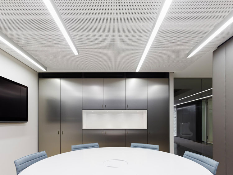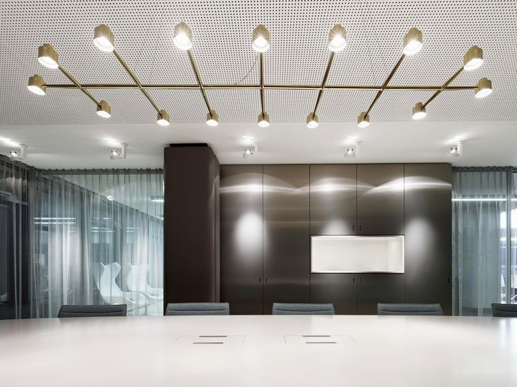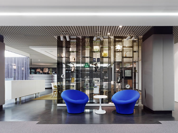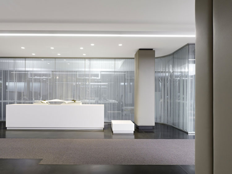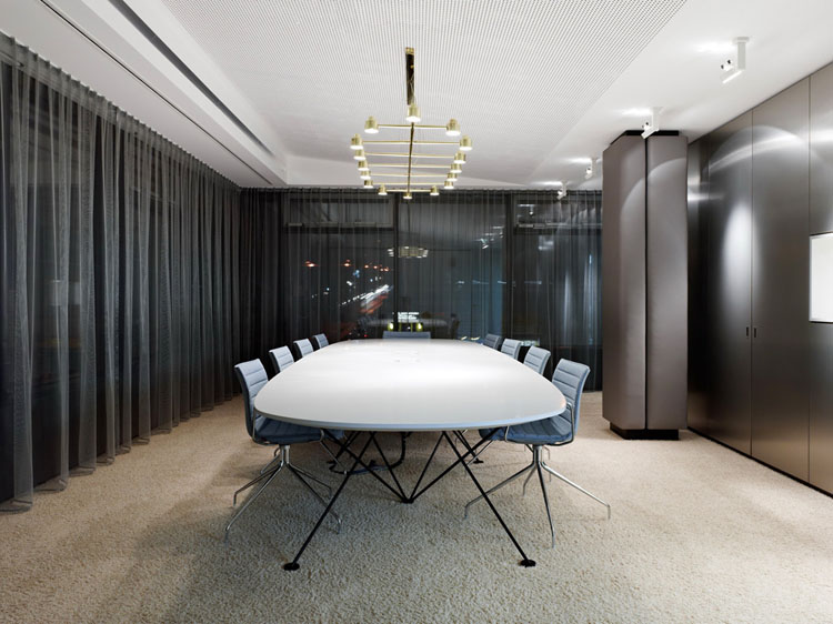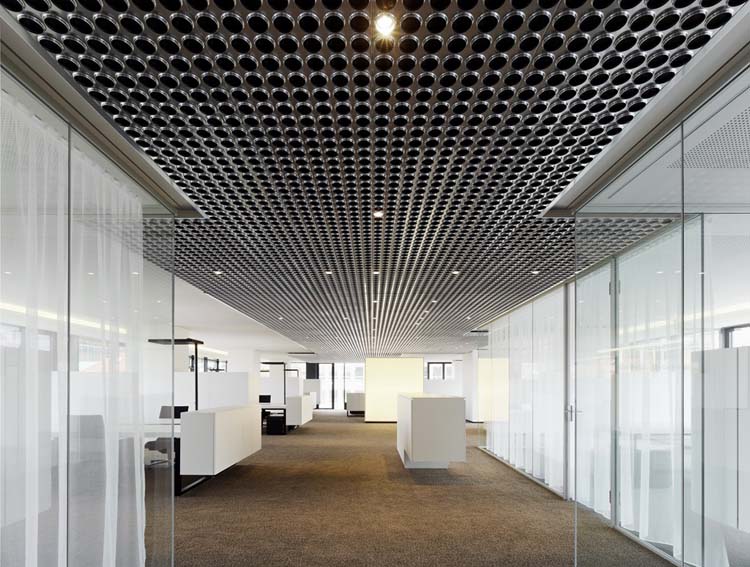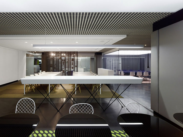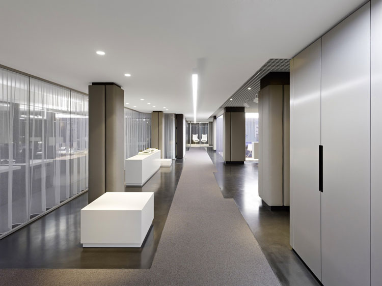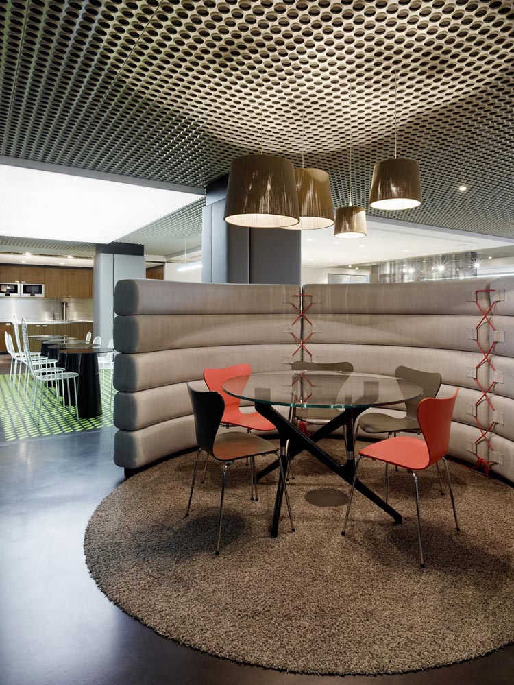 其概念是設(shè)置一個(gè)為所有部門共用的交流空間,以及滿足不同協(xié)作需要的不同分區(qū)。原先單獨(dú)、分散化的辦公室變成大型開(kāi)放式的辦公空間,鼓勵(lì)同事之間的交流。每一個(gè)樓層都有單獨(dú)的辦公室和單獨(dú)的工作組空間,以及大型開(kāi)放式工作間。各個(gè)工作站的工作人員能夠相互交流。玻璃立面的辦公室中,十字形的結(jié)構(gòu)將開(kāi)放式的空間分隔為各個(gè)單元,但又是集中的工作環(huán)境。一系列暖色調(diào)的材料營(yíng)造出不同的氣氛,有時(shí)候讓員工感覺(jué)到像在家里一樣。辦公樓中的地毯有著清晰的路徑指示和功能分區(qū)。就餐區(qū)地板上的綠點(diǎn)如同變魔術(shù)一樣變出草地的效果,構(gòu)筑起通向露臺(tái)的一道概念式的橋梁。向露臺(tái)打開(kāi)的半圓形裝飾空間與其他部分區(qū)分開(kāi)來(lái),透明的蕾絲幕布構(gòu)成了半私密的空間,而清新的色彩、深藍(lán)色的桌子和粉色的地毯,無(wú)不為員工帶來(lái)激發(fā)工作情緒的氛圍。